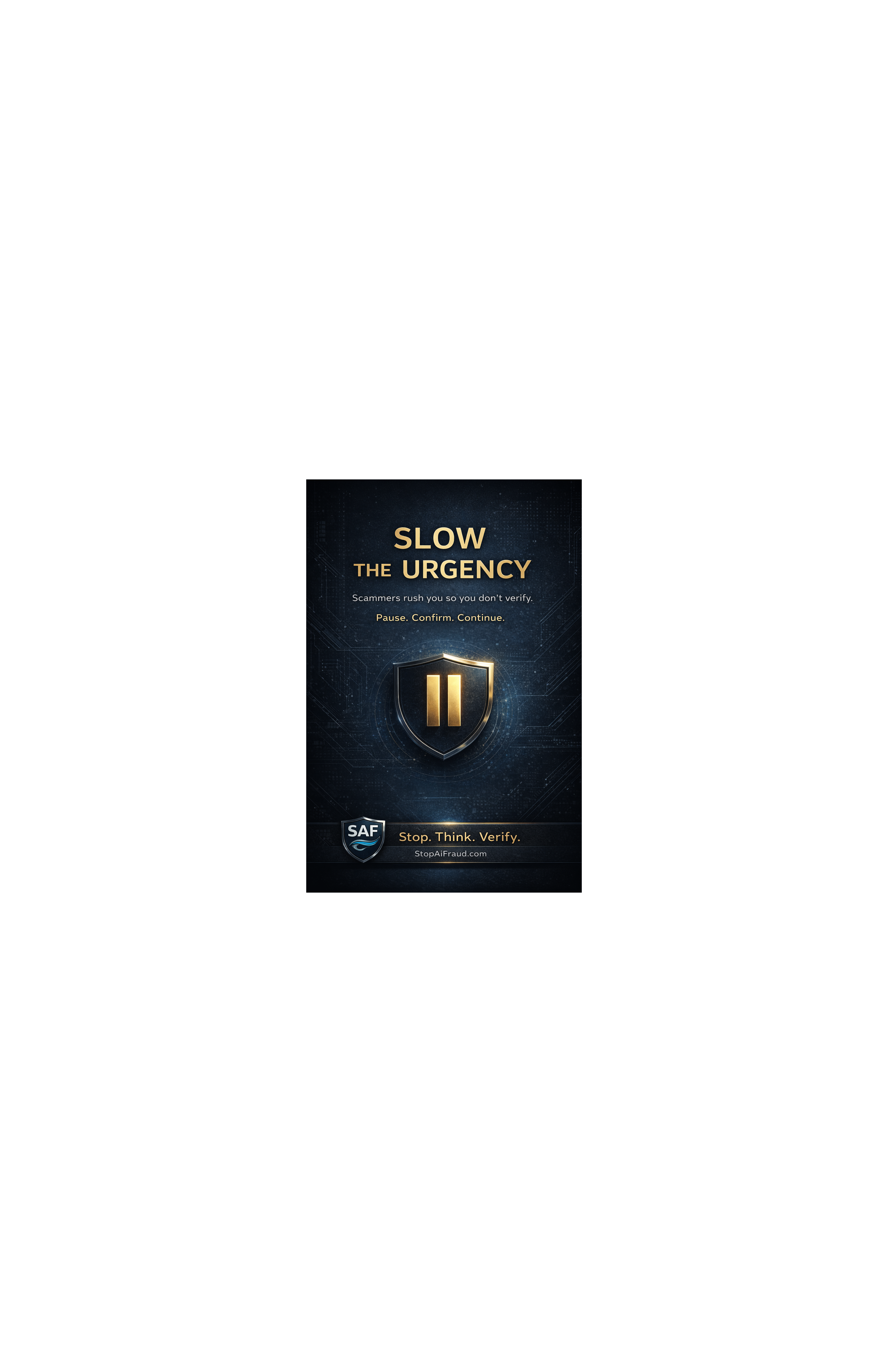 All posters include StopAiFraud.com branding with our tagline: "Stop. Think. Verify."