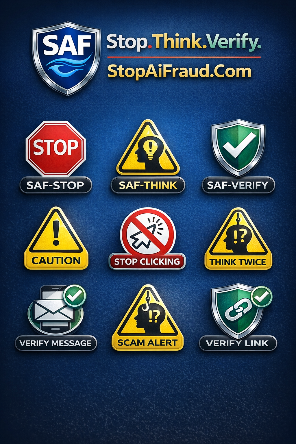 Attribution requirement: When using SAF symbols in educational materials, please include "Part of the SAF Digital Safety Symbol System™ — StopAiFraud.com" and ensure the Stop. Think. Verify. framework remains visible.
